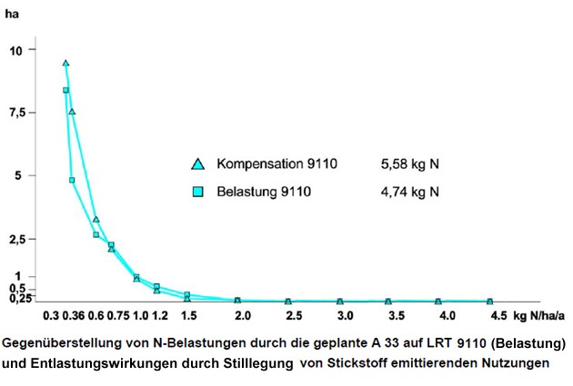 Ein besonderer Schwerpunkt bestand darin, Maßnahmen zu ermitteln und soweit sinnvoll zu quantifizieren, die den Schaden minimieren und die Kohärenz des Natura 2000 Netzwerkes für die betroffenen Lebensraumtypen sicherstellen. So wurden Stickstoffeinträge infolge der Düngung von Ackerflächen ermittelt. Indem diese Flächen im Rahmen des Maßnahmenkonzepts extensiviert werden, entfallen durch den Düngeverzicht in Zukunft Stickstoffeinträge in derselben Größenordnung, wie sie durch die Straße hinzukommen. Je nach Konstellation kommen solche Maßnahmen zur Kohärenzsicherung oder auch zur Schadensbegrenzung in Frage. Im vorliegenden Fall war eine Anerkennung als Schadensbegrenzungsmaßnahme nicht möglich, weil unterschiedliche Flächen be- und entlastet wurden, und die Entlastung nicht ausreichte, um die Gesamtbelastung auf das Niveau der Critical Loads senken zu können.