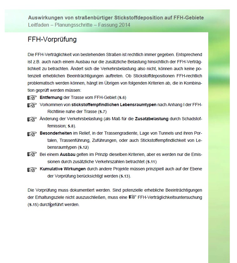 Mit dem Leitfaden zur Ermittlung und Bewertung der Auswirkungen von straßenbürtiger Stickstoffdeposition auf FFH-Gebiete wurde der Straßenbauverwaltung eine Anleitung in die Hand gelegt, auf welche Punkte in Bezug auf den Nachweis der FFH-Verträglichkeit von Stickstoffdepositionen zu achten ist. Gleichzeitig wurde der damalige Stand der Konventionsbildung dokumentiert (Abschluss April 2011).